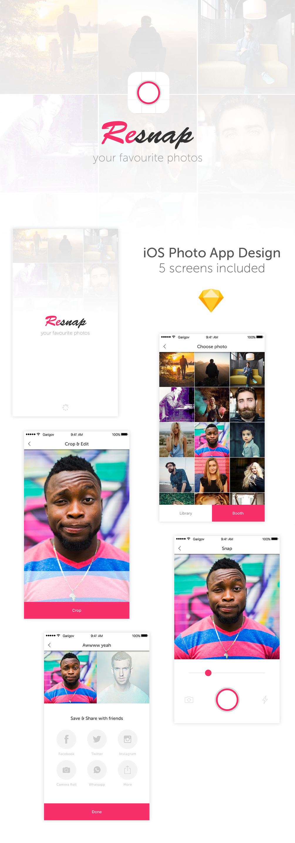 Resnap your favourite photos. Download this great small Sketch app design concept for your next photo editing app. In the package, you will find 5 well-designed screens + 2 icons (light and dark version).